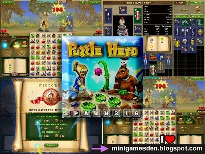 Embark on a thrilling and amazing journey in this unique game! The Hero in you must save your kidnapped brother, Tristan, by freeing him from Zalock and his evil Army of Darkness! Outwit the puzzle and battle more than 50 mystical monsters that guard the road to the Kingdom of Fog. Increase your power by gathering gold and using it to shop for magical amulets, an amazing selection of weaponry, armor, and clothing accessories. Adventure and glory await you in Puzzle Hero!