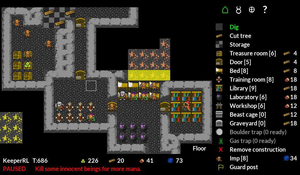 KeeperRL is a Dungeon Keeper and Dwarf Fortress inspired dungeon simulator built on top of roguelike mechanics. My vision is that you are a Sauron-like character, searching for ultimate knowledge of destruction. What makes the game different from other RTS is that you can, and are encouraged to, control your main character and lead your minions to an open war. The characters use equipment, scrolls, potions, spells, and other things you would expect in a roguelike. Combat is turn-based and very tactical. The whole world is procedurally generated, and there is adventure mode too.