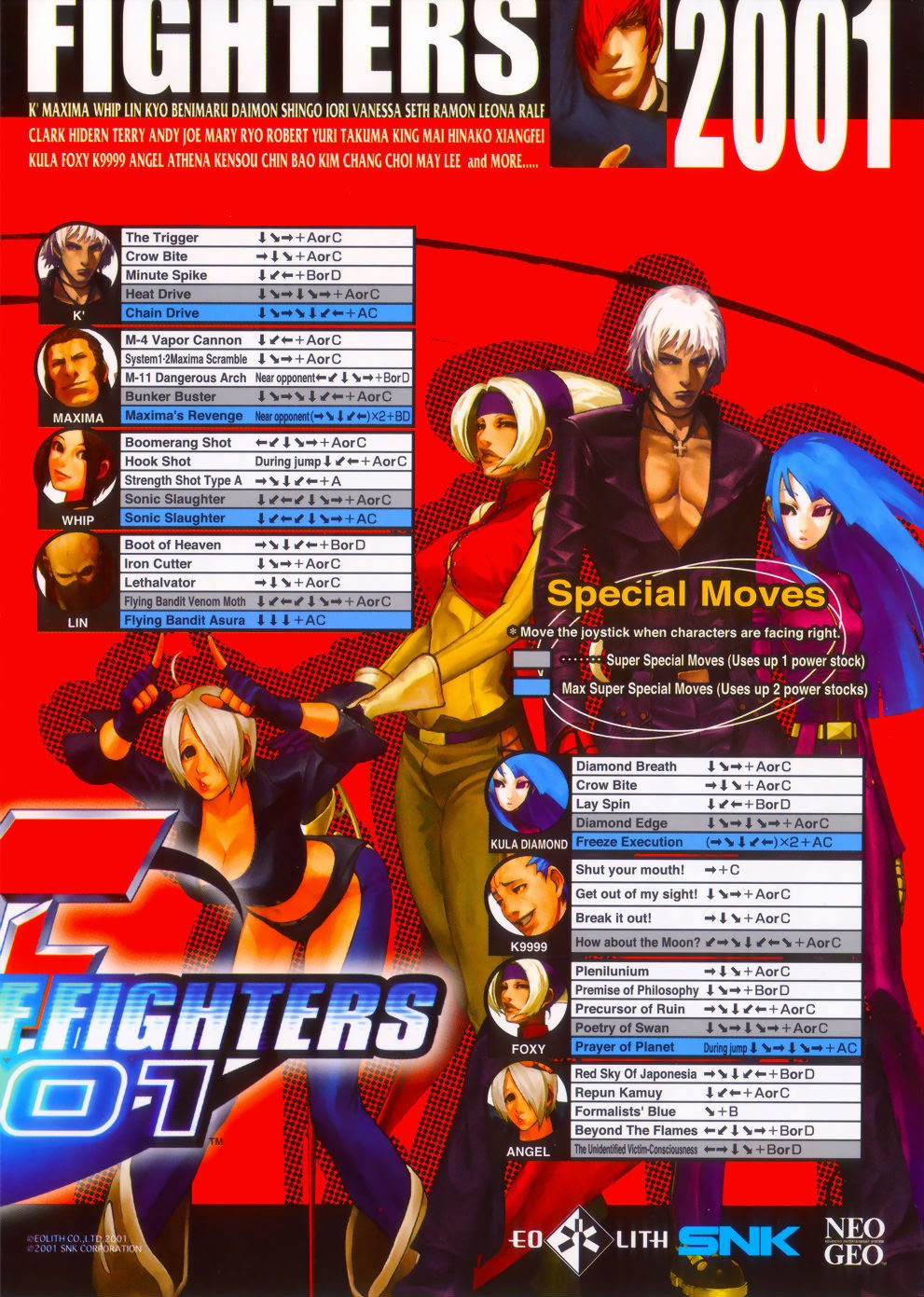 Arcade Game developer SNK officially went out of business in 2001, but that hasn’t seemed to slow down what is apparently a new generation of games for the company’s NeoGeo arcade hardware. One of the last projects the company was working on was The King of Fighters 2001, the latest edition in SNK’s annual fighting game series, along with a new developer, Eolith. And while certain aspects of KOF 2001 may seem very different from previous games, spend some time with it and you’ll eventually realize that it’s one of the deepest, most technical 2D fighting games ever made.
