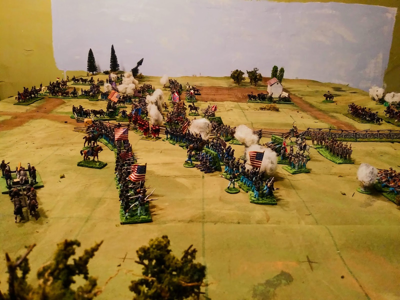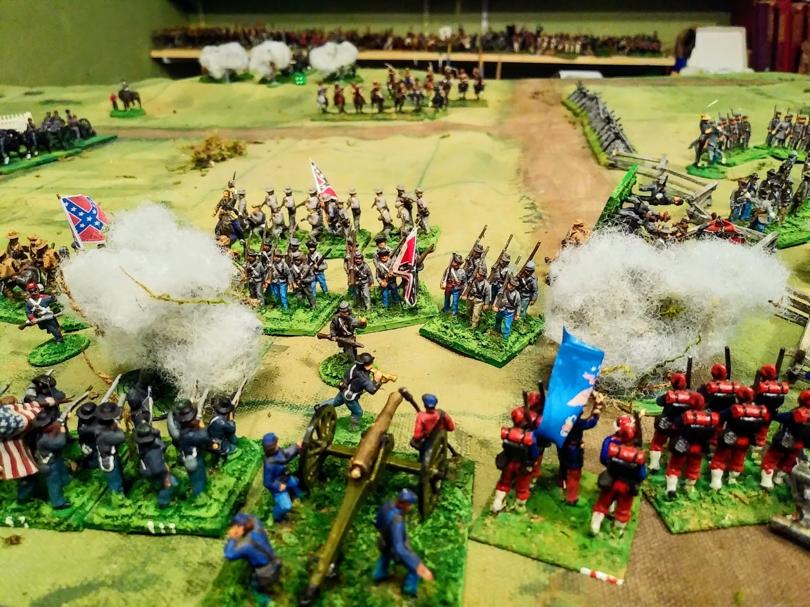 Firefights proved a bit tougher since my mind was locked into various methods that had become standard but which failed the test one after another. (yes, I know, it was a 1/72nd nightmare with the dead rising only to be shot again, and again and again.) Eventually, I realized that none of my usual tricks were going to give me what I wanted for my ACW battles. I started thinking broader, trying some brand new things until one of them started to remind me vaguely of a game I used to enjoy playing. A bit more thinking, exploring, trying and adjusting and suddenly and I had what I needed and wanted. No need for marker dice to follow units around tracking hits, no sudden death from firefights for average units but not endless firefights either.