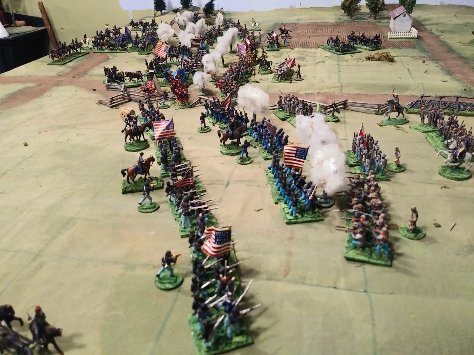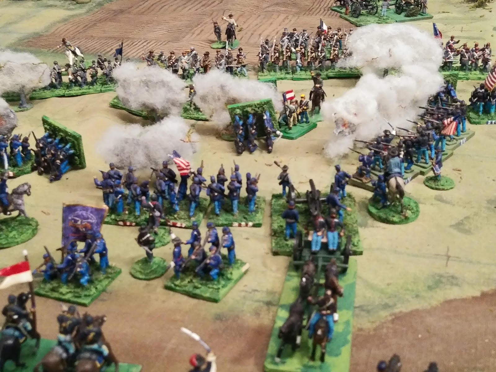 | Two turns later, with modified rules in play, a Reb unit has punched their way through the Yankee first line. Well, the rump of a Reb unit anyway. |