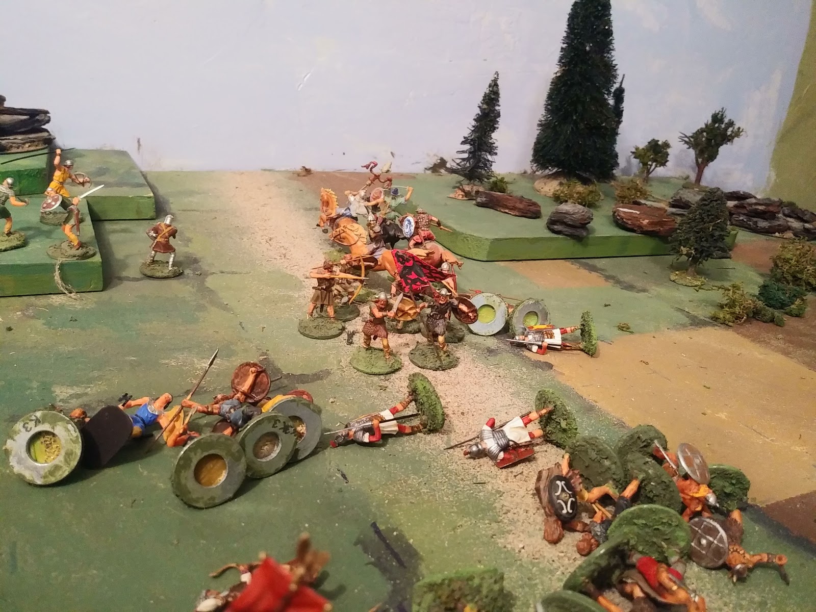 | The local soldiery who had arrived first to hold the pass had bravely stood and repulsed charges by Dearg Mor’s household cavalry and a band of Saxon raiders but were eventually driven back and broken by subsequent charges. By then however, Duke Johan and the armoured veterans of the White Cohort had arrived. These proceeeded to repulse Earl Helgin’s Hearthguard not once but twice, cutting them to shreds. Follow up attacks by Saxon warriors and continuous showers of arrows and javelins slowly whittled their numbers but by then the Duke was at hand! |