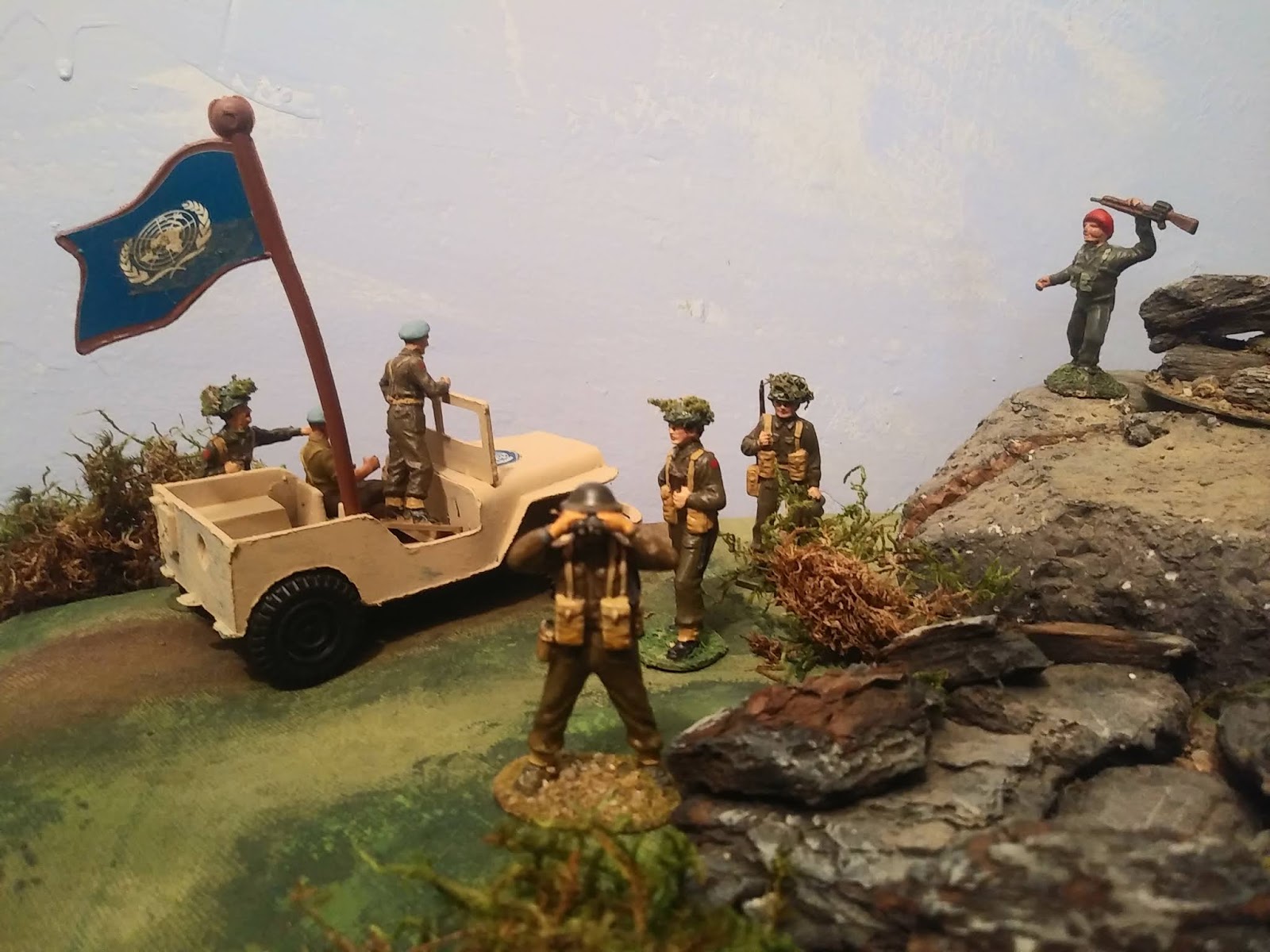 | UN peacekeepers pass a Red Patch outpost on their way to the border. |