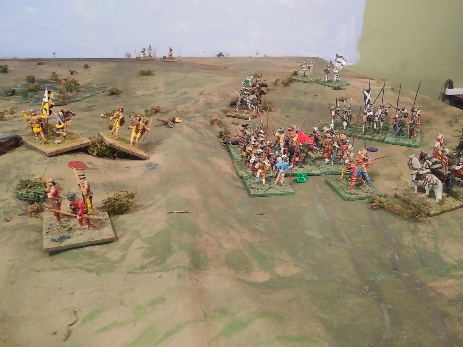 True to fashion, the Scots retreated as the English pressed forward so the Warden sent a troop of his Border Lances galloping forward. As they approached the crest they were surprised by a fierce volley as a forest of pikes suddenly poked up behind the crest and began advancing. The Lancers turned and fled to safer ground. (Sorry, that was supposed to be “prudently pulled back to report as was their duty”.)