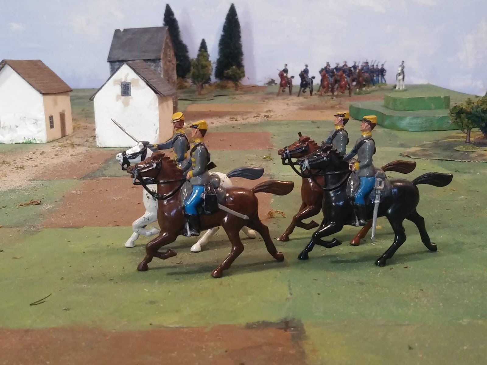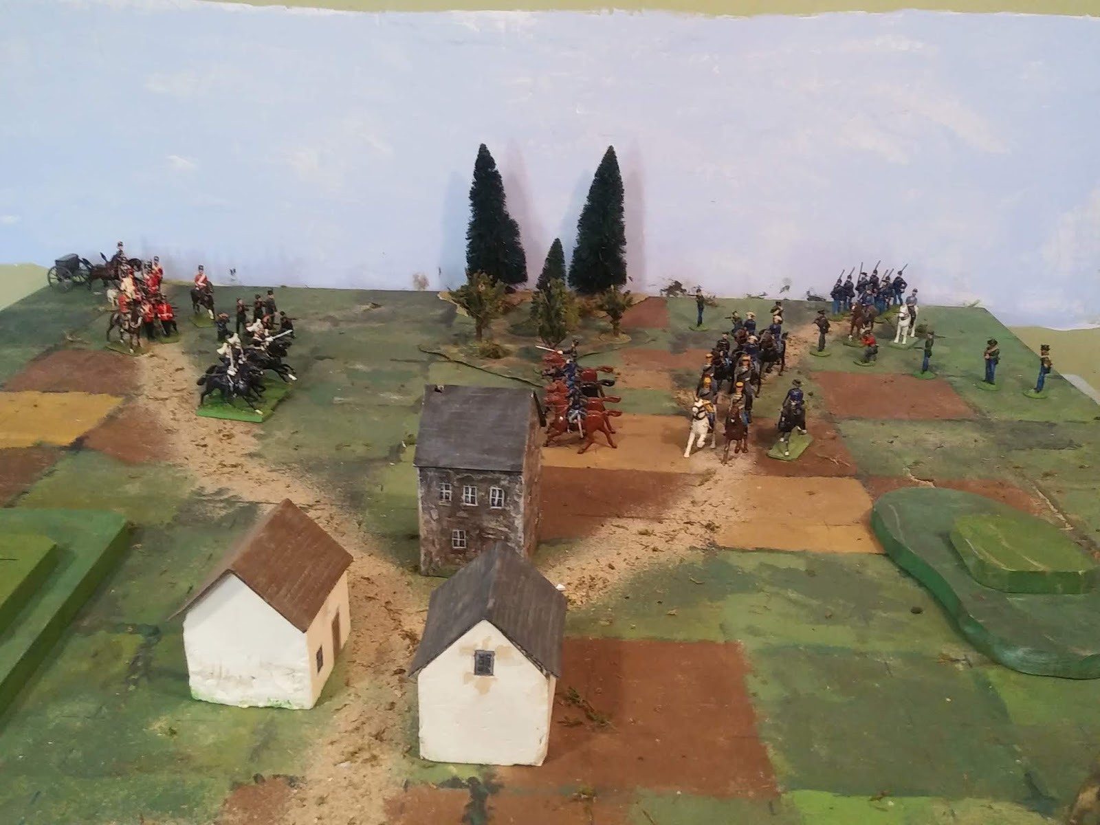 Rifle fire is similar to Charge! skirmisher fire with a die per figure, but again shorter ranges, 6’s hit at long range, 5,6 at short. Troops in cover as well as skirmishers, cavalry and artillery suffer 1/2 casualties as in Charge! but round down rather than up.