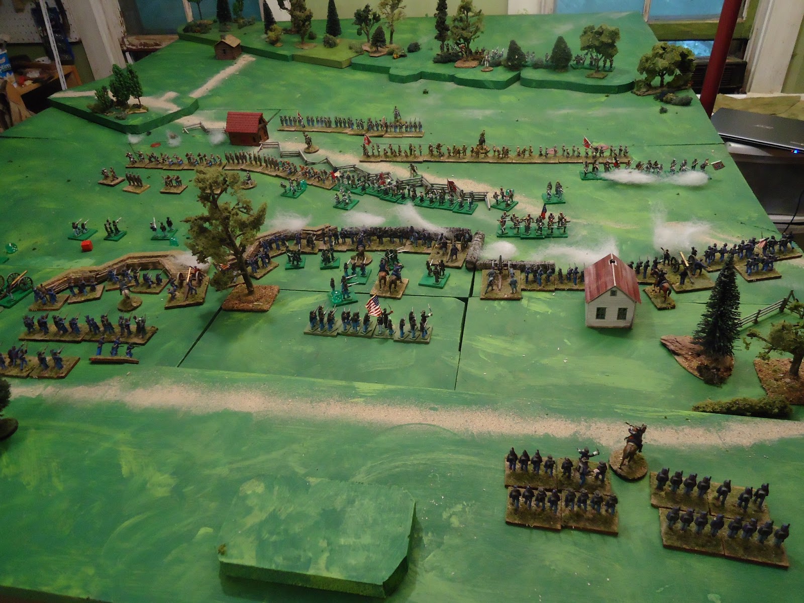 My latest decision has been to put 2 of my regiments together to form standard sized brigades of 6 stands for now but to write the rules to allow for variable sized brigades. This will give me about 10 infantry brigades with room for another couple. It is no accident that this was the standard On to Richmond Union Brigade, smaller than Fire & Fury Brigades but bigger than Volley & Bayonet ones. To achieve this I merely need to roughly double my ground scale and halve weapon ranges. Clear the table!