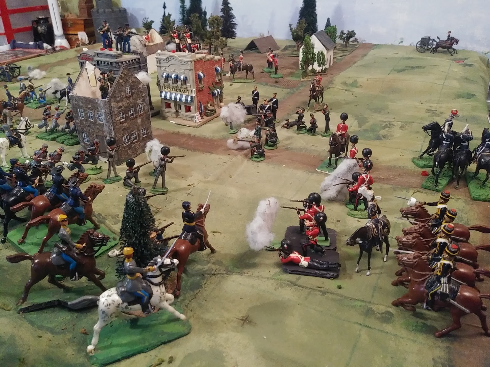 The 5″ grid that Sunday’s game was played on worked better and the troops gamely pretended to be fixed to a single base per unit with rules adjusted back to something very like the old Square Brigadier. The corner markers for the four inch grid on the main table have mysteriously reappeared though and I plan to give them a go today, a tight fit for 54’s and some terrain items but an expansive field with than twice as many squares as the six inch grid and room for more units as well as more manoeuvre.