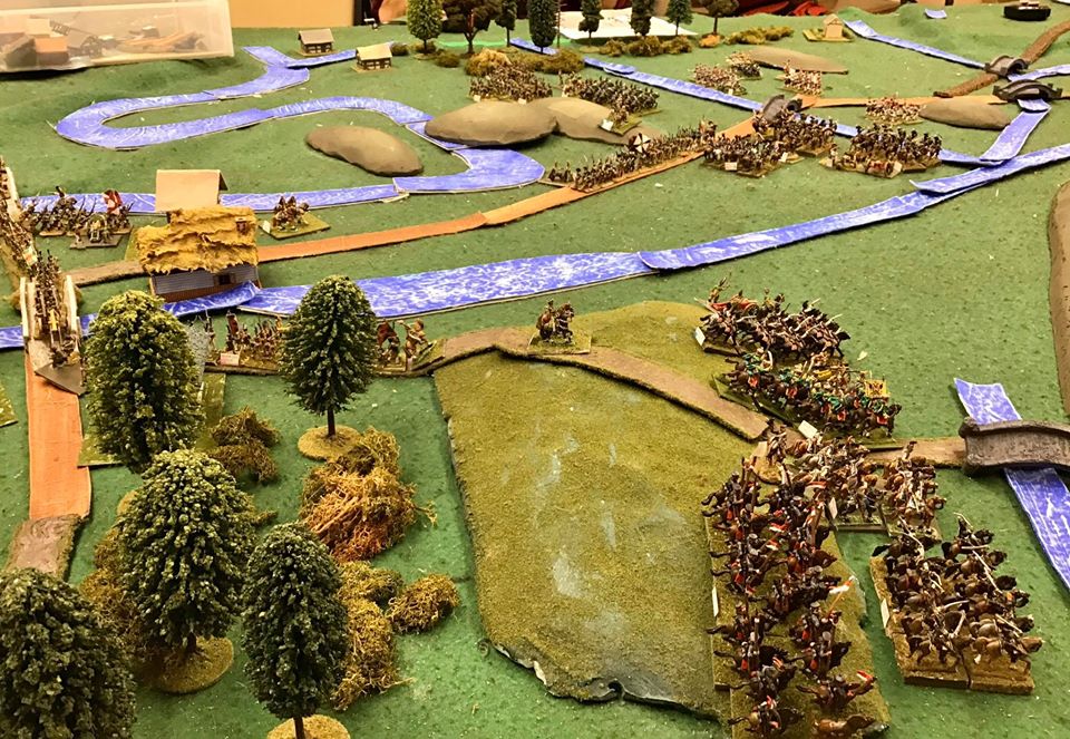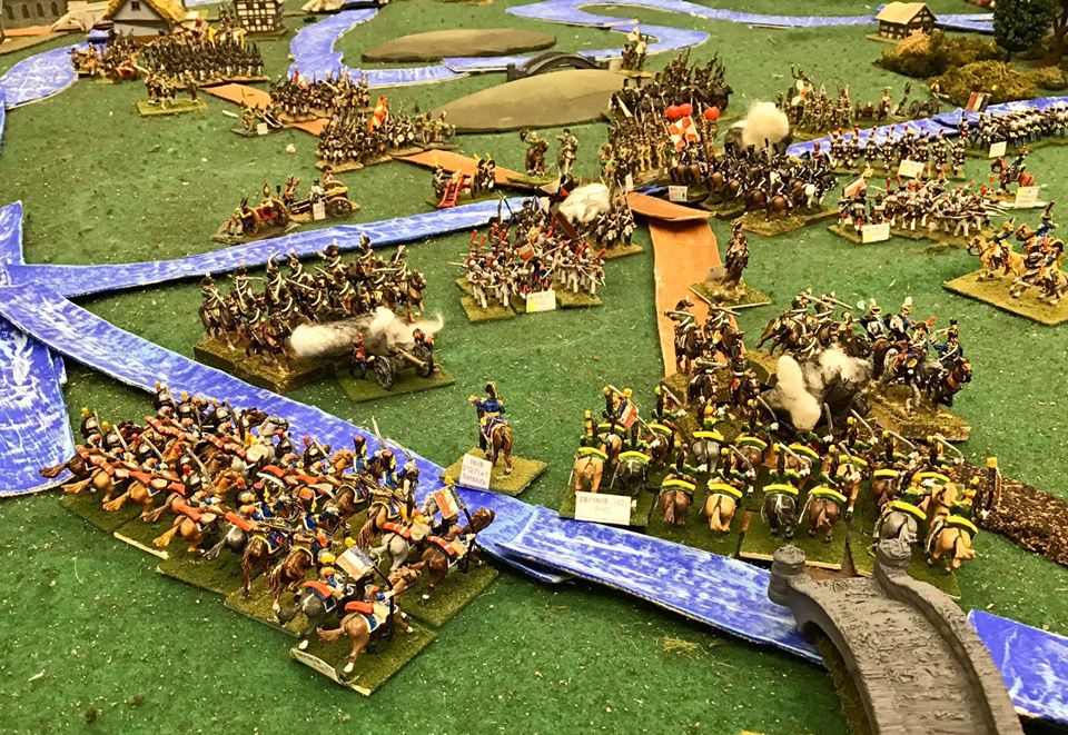 I will admit to a tinge of nostalgia at the sight of a table, loaded with 15mm troops yet not crowded, BUT, given that I needed to don reading glasses and peer closely to tell one unit from another, I’m not tempted to rebuild my ‘lost’ 15mm armies. Actually, I don’t need to, apart from the horde of 15mm figures Jeff has painted, he has also acquired used figures from several different people including a bunch of my old 1799 Austrians and Russians, some of the latter which I have had the pleasure to command in battle again from time to time.